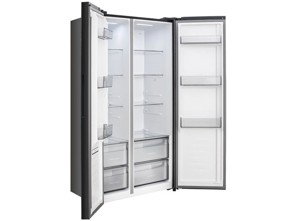 Tủ lạnh Hisense Inverter 544 lít RS708N4EBU sở hữu kiểu dáng Side by Side hiện đại, mặt gương đen cao cấp sang trọng, tạo điểm nhấn tinh tế cho không gian bếp. Với dung tích lớn 544 lít (ngăn đông 197 lít, ngăn mát 347 lít), sản phẩm đáp ứng hoàn hảo nhu cầu lưu trữ thực phẩm của gia đình từ 4 – 5 thành viên. Thiết kế cải tiến hệ thống ống dẫn khí giúp tăng thêm 3.5 lít dung tích so với dòng truyền thống mà vẫn tiết kiệm diện tích, kích thước gọn gàng 914 x 630 x 1790 mm.